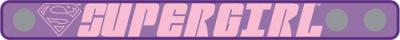 Die-cut rubber snap-on bracelet with a great design featuring the classic "S" shield and the word "Supergirl". Bracelet features pink lettering on a purple background.
