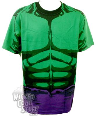The Incredible Hulk T-Shirt! This green t-shirt is printed in classic Hulk green with muscle tone and purple pants...