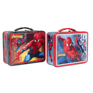 This set of two Spider-Man lunch boxes is equally perfect for the cafeteria or on your shelf as a collector's item. The colorful graphics leap out at you in a 3-D relief of the web-slinger. These sturdy tin boxes feature a plastic handle and metal clasp, and measure 6 inches tall, 7.5 inches wide, and 3 inches deep.