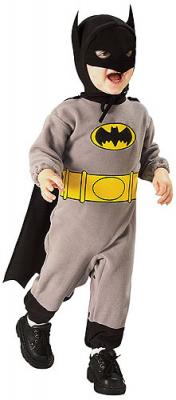 This fleece kids Batman costume will transform your baby into one of the most famous and best-loved superheroes of all time. The jumpsuit has a sewn on belt and Batman logo on front. The black cape attaches to the jumpsuit with snaps at the shoulders. The suit snaps up the back for easy dressing/undressing. It also has snaps around the insides of the legs for easy diaper changes. The soft fleece headpiece ties around the chin. It's everything you're looking for in a newborn costume.
