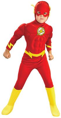 This complete "FLASH" costume has everything to transform your toddler / child into his favorite superhero in a flash! The all-polyester jumpsuit has foam lining in the chest and shoulders to create a muscular look. The yellow boot tops are attached.