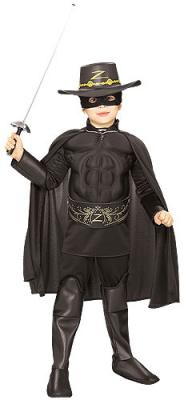 Wearing this child deluxe Zorro costume, your child will be the hero of the day! The all polyester jumpsuit has a foam liner in the chest and shoulders to create a muscular appearance. The boot tops are attached to the jumpsuit, and jumpsuit has a velcro closure at back of neck. The belt has the famous Zorro logo on it. The black pullover cape has gold trim along both front sides (trim not seen in photo). The decorative gold chain attaches to the ends of the cape with velcro. A hat with an adjustable chin strap (strap is not shown) and a foam eye mask top off this great child Zorro costume. Accessorize this costume with a sword and let the legend of Zorro live on!