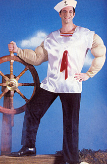 Popeye Costume contains:white satin shirt with stuffed, muscle arms and hat with printing on front.