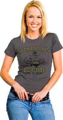 This Jr. sized Batman shirt features a distressed print of the Caped Crusader . The print reads, "Batman Says...Be Cool Stay In School".