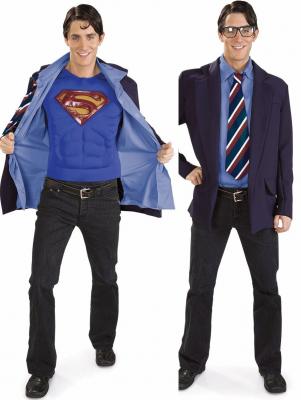 Make a smooth change from Clark Kent to Superman with this costume. The man of steel always lies just beneath the surface to help fight the good fight. The Reversible Clark Kent/Superman includes: suit jacket with attached shirt front & tie and Superman muscle chest, and glasses.