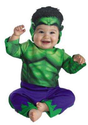 Infant/Toddler costume includes: Green bodysuit with purple pants and a Hulk character hood.