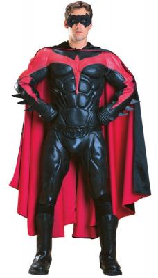 Holy costumes, Batman! He looks just like me! This deluxe quality costume consists of eye mask, cape, jumpsuit, Black & Red chest pieces, belt, gloves, leg pieces, boot covers, and crotch piece. The perfect adult-sized disguise for fighting crime!! Batman Grappling Hook and Bat-A-Rang are not shown in image. These are new Batman Accessories, sold separately.