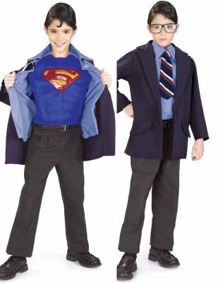 The Reversible Clark Kent/Superman includes: suit jacket with attached shirt front & tie and Superman muscle chest, and glasses.