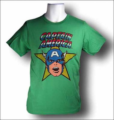 This is a giant Captain America Head, most likely taken from a Jack Kirby illustration, floating in front of a giant, yellow star on a shamrock green T-Shirt. Man, the colors just blend beautifully on this one, don't they? A T-Shirt that goes great on either the Fourth of July or St. Patrick's Day!
