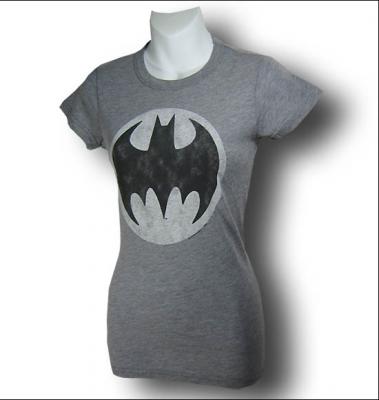 Here's a Batman shirt for the ladies. The Ladies! This is a Heather Gray Juniors fitted T-Shirt featuring a more circular Bat Symbol. The ladies!