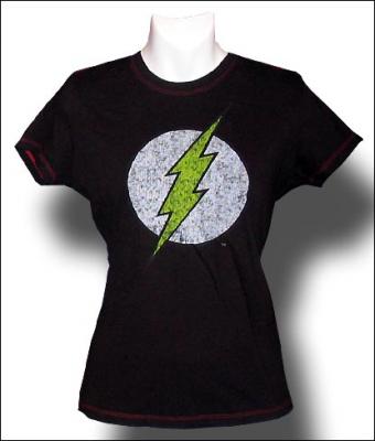 One of the newest designs in 2007. This is a chocolate colored Junior's (women) shirt with cap sleeves and red threaded seams. The Flash symbol is a distressed image with that classic worn look and feel.