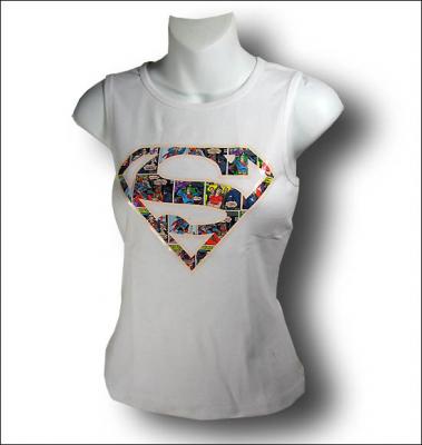 A cute tank top with a Superman 9" S symbol pattern with old nostalgic comic strips in the back ground.