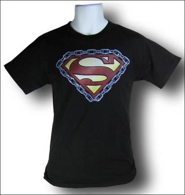 This black Superman T-Shirt features a slightly faded Superman Shield Symbol surrounded by....chains. Because, if you want to trap Superman, chains are definitely the way to go. Because they work. Because they have a great track record when holding superman secur.......THEY DON'T WORK ,