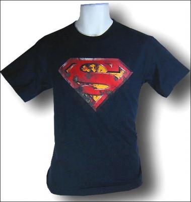 What we got here, is a Superman T-Shirt that got all wet and was laid out in the sun too dang long. Now just look at this dang Superman Symbol. It's gone and rusted on me.....DANG IT! This is a Navy Blue T-Shirt featuring A silk screened Superman Shield Symbol a little worse for wear and certainly not well maintained. Of course, you haven't seen the Superman Fungus Shield Symbol T-Shirt, so maybe that rust... well, maybe she ain't so bad after all.