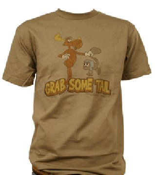 Bullwinkle the moose has his pal Rocky the Flying Squirrel by the tail... This safari green t-shirt reads GRAB SOME TAIL!