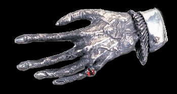 Creeping silently like the night, this Nosferatu's Hand Belt Buckle is the infamous hand of a withered and undead being that you can wear, allowing it to clutch at your belt strap while adding a touch of dark and vampiric style to your ensemble. Nosferatu is a popular term that is synonymous with vampire, and the two can often be interchanged with little loss in meaning. And given that the hand depicted by this belt buckle looks to be exceptionally old and emaciated, there can be no doubt that it is a vampire's hand. Long, bony, narrow fingers, tipped with prominent fingernails, reach out on this belt buckle, while the wrist is covered with a cuff and collar suited only for the best dressed of citizens, making this vampire a discerning individual indeed. Adorning one of the hand's fingers is a vibrant red cabochon ring (which cannot be removed), lending the hand the perfect level of deathly style. The belt buckle is crafted from fine English pewter and features dark and polished highlights to attain the perfect look and balance of color and shading. Being a belt buckle, it is designed to be worn with a belt and is fully compatible with either the Web Belt Strap (AG-WB1) or the Leather Belt Strap (AG-L1B), which are both available on this site. For a truly eerie and eccentric look, pick up this Nosferatu's Hand Belt Buckle and add it to your collection so that you can wear it every now and then, either with contemporary outfits for that modern-vampire style or with vampire costumes for that eclectic look that defines any good vampire.