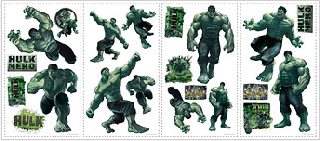 Hulk Smashes into your room with this ultra cool set of peel and stick wall appliqué stickers. Just peel and stick! The Hulk Appliqués include 20+ self adhesive, pre-cut reusable wall accents. The Hulk Appliqués displays nice, colorful artwork of the Incredible Hulk in different poses, along with other Hulk symbols. The Appliqués are removable, repositionable, and re-usable. The size of some of the larger Wall stickers Appliqués in the package are approximately 8"H to 11.5"H in size, and there are smaller stickers in the package too (see image). The Hulk Appliqués works best on smooth surfaces, not recommended on textured or gloss finished walls.