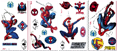 Restyle a room in minutes with the Spiderman Peel & Stick Wall Appliqués. Just peel and stick! The Spiderman Appliqués include 20+ self adhesive, pre-cut reusable wall accents. The Spiderman Appliqués displays nice, colorful artwork of Spiderman in different poses, along with Spiderman symbols. The Appliqués are removable, repositionable, and re-usable. The size of some of the larger Wall stickers Appliqués in the package are approximately 8"H to 11.5"H in size, and there are smaller stickers in the package too (see image). The Spiderman Appliqués works best on smooth surfaces, not recommended on textured or gloss finished walls.