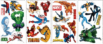 Restyle a room in minutes with the Marvel Heroes Peel & Stick Wall Appliqués. Just peel and stick! The Marvel Heroes Appliqués include 26 self adhesive, pre-cut reusable wall accents. The Marvel Heroes Appliqués displays nice, colorful artwork of Spiderman, Hulk, Iron-Man, Captain America, The Thing, Wolverine, and other Marvel Hero friends. The size of some of the larger Wall stickers Appliqués in the package are approximately 6"H to 9"H in size, and there are smaller stickers in the package too (see image). The Appliqués are removable, repositionable, and re-usable. The Marvel Heroes Appliqués works best on smooth surfaces, not recommended on textured or gloss finished walls.