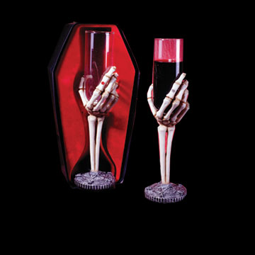 The ultimate Gothic table glassware. Natural look skeleton hand holding a real wine glass. 10 inches tall. Packed in a coffin shaped box with acetate top.