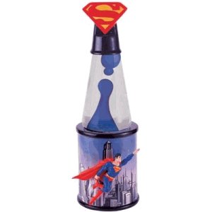 Warner Bros Superman Collectible Lava Lamp Lighting (premiere edition). Features a resin Superman figure in flight on the front, and a cityscape of Metropolis on the ceramic base. A bold red and yellow Superman logo rests at the top of the glass Lava bottle. This Lava Lamp measures stands 19 1/2 inches tall on a 7 inch base, plugs into a wall outlet.