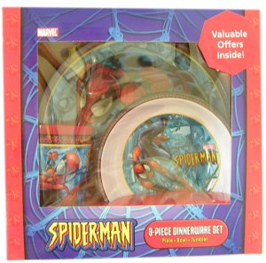 Marvel Spiderman Kids Dinnerware Set is fun to play and practical to use, package includes Cup, Bowl and Plate. Each item features your favorite Heroe Spiderman graphic on it, comes with a pretty gift box.