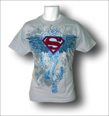 Here's a light gray Superman T-Shirt featuring a red, felt Superman "S" Shield Symbol supported by the blue, loose line work of a pair of angelic wings! Made from 100% Cotton, this Superman T-Shirt is layered with light, charcoal groove-lines, giving this Superman T-Shirt the visual appearance of a deeper texture or worn, tread-weary facade.