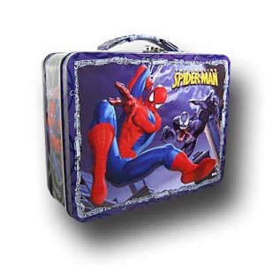From Tin Box we have the Spiderman Purple Webbed Border Chased by Venom Square Lunchbox. Lunchbox measures 7.75" across 6" high and 2.75" deep.