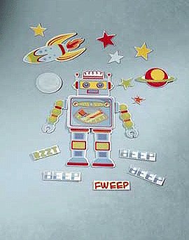 Turn your refrigerator into a cool celebration of R2D2 or Lost In Space! Fun and colorful, these outer space magnets are a great way to express yourself and decorate your refrigerator or other magnetic surfaces throughout your home or office. Many sliding closet doors are metal and perfect for child's bedroom use. The Space Age set includes 24 magnetic pieces....Giant 13" Robot, 10" rocket spaceship, stars, moon, planet mars and BEEP Signs. Express your creativity by rearranging them to form your own unique display (see image below for an idea). These are heavy duty flexible magnets and great for creating some space fun.