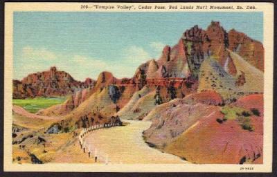 Vampire Valley, Cedar Pass, Bad Lands National Monument, SD. So called for it's red stone. Linen postcard, not used.