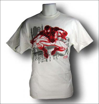 This Spiderman T-Shirt features a red, screenprinted Spiderman filled with black glitter....like newly poured tar on a desert highway. Another limited production Spidey shirt.
