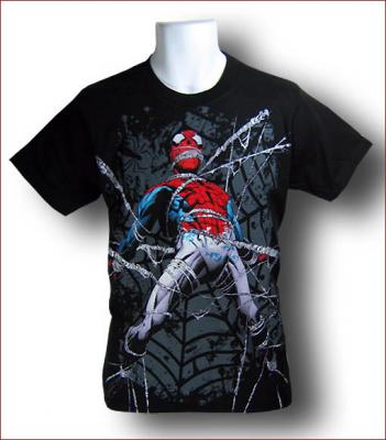 This is a black t-shirt with a screen printed image of Spiderman, bounded up with a bunch of webbings.