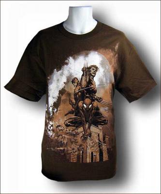 This is a chocolate brown shirt with an image of Spiderman, Wolverine and Dare Devil.