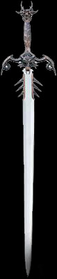 This highly unusual sword has been designed to live up well to the expectations of its name. The pommel stands in none of the usual shapes; rather, a fanged face with three pairs of horns forms the incorporated pommel above a grip textured with stylized scales. The grip flows into a guard with quillian formed of the side-horns of a head similar to that forming the pommel. A small rain-guard is made of the upper jaw and fangs of the head featured on the guard. The non-traditional ricasso features three spikes mounted on each side, angled downward toward the sword tip.