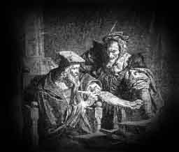 Faust, the son of a farmer in Rod, near Weimar, studied theology at Wittenberg. Ambitious to be omniscient and omnipotent like God, he dived into the secret tore of magic, but unable to make much progress, he conjured the Devil in a thick forest near Wittenberg. Not in the least intimidated by the Devil's noisy behavior, he forced him to become his servant. Faust, having gained mastery over demons, did not regard his salvation endangered, and when the Devil told him that he should nevertheless receive his full punishment after death, he grew extremely angry with him and bade him quit his presence, saying: "For your sake I do not want to be damned." When the Devil had left, Faust felt an uneasiness not experienced before, for he had become accustomed to his services. Accordingly, he ordered the Devil to return, who now introduced himself as Mephistopheles. The name is derived from the Greek , "not-the-light-loving," and was afterward changed to Mephistopheles. He now made a compact with the Devil who consented to serve him for twenty-four years, Faust to allow him afterward to deal with him as he pleased. The contract was signed by Faust with his blood, which he drew with a penknife from his left arm. The blood, running out of the wound, formed the words: Homo fuge (man, fly!). This startles Faust, but he remains resolute.