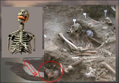 This photo made available by forensic archaeologist and anthropologist Matteo Borrini of Florence University, Italy, shows the 16th-century remains of a woman with a brick stuck between her jaws, as depicted in the computer generated image at left. The skeleton was unearthed in 2006 in an archaeological dig near Venice. Experts say the brick between her jaws is evidence that she was believed to be a vampire. The unusual burial is thought to be the result of an ancient vampire-slaying ritual and links the legend of these mythical bloodsucking creatures to medieval ignorance of how diseases spread and what happens to bodies after death, experts said. The well-preserved skeleton was found in 2006 on the Lazzaretto Nuovo island, north of the lagoon city, amid other corpses buried in a mass grave during a plague epidemic that hit Venice in 1576.