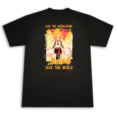 Officially licensed Heroes Save The Cheerleader Black T-Shirt. Features Heroes cheerleader design and reads, 'Save the Cheerleader - Save the World.' 100% cotton.