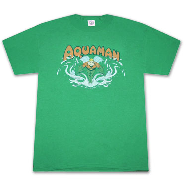 Officially licensed Aquaman Splash Green Tee Shirt. Features Aquaman and waves. 100% cotton.