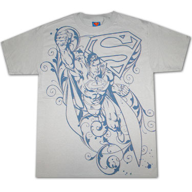 Officially licensed Superman Blue Scrolls Silver Tee Shirt. Features stylized Superman design in blue on the front of this tee. 100% cotton.