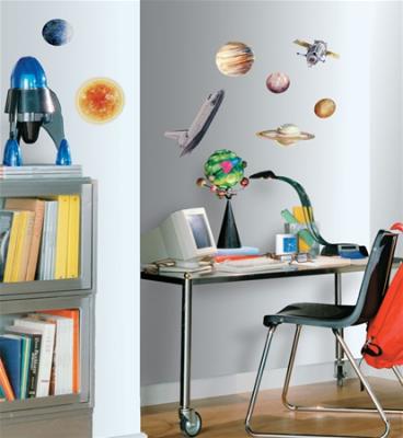 Space... The Final Frontier beams right into your bedroom with our space travel set of peel and stick wall appliques. Suns, stars, planets, satellites, and even space shuttles will make your travels to the outer confine of the galaxy most pleasant!