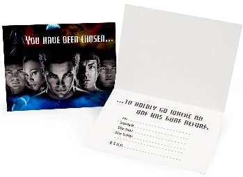 These Star Trek Invitations (8 count) will have your Trekkie friends beaming over. "You have been chosen..." is on the front with the young Star fleet Cadets waiting for their first mission...your party! Inside has space for all pertinent information. Includes 8 white envelopes. (c) 2009 Paramount Pictures Corporation. (c) 2009 CBS Studios Inc. Star Trek and related marks and logos are trademarks of CBS Studios inc. All Rights Reserved.
