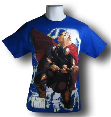 Here we have The Mighty Thor on a blue T-Shirt, conjuring up some mighty weather with the help of Molje...Myole.... HIS MIGHTY HAMMER, mostly involving lightning and, well.....storms. Yeah, Thor doesn't usually bring the sun with him where he goes.
