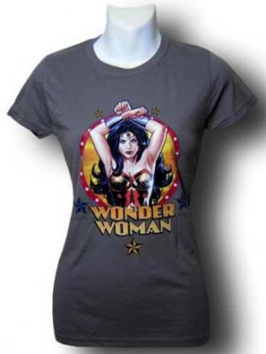 This charcoal gray Wonder Woman t-shirt features a gorgeous image of Wonder Woman holding her hands up over her head and ready to bring her magic bracelets into action.