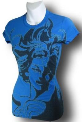 Here's an image of Wonder Woman's profile, as if formed by a steady procession of raindrops, on a Turquoise blue T-shirt. Aww, so pretty! Wonder Woman, please, hear my poetry!