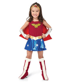 Leave it to you to save the world! You're a wonder in this bright dress with attached cape. A gold headband, belt, silver armbands and boot tops are included. 7-pc. set. Polyester. Made in USA and imported.