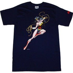 This officially licensed Wonder Woman t-shirt features a beautiful front print of artwork by Michael Turner. Wonder Woman leaps into battle with her magic lasso at the ready. Standard mens size tee. Shoulder-to-shoulder taped, sleeve and bottom hem are double-needled. 100% cotton. Officially licensed.