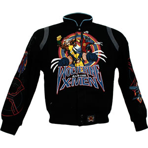 Wear all the characters from the hit animated television series, Wolverine and the X-Men, on this kids twill embroidered jacket. This colorful jacket features detailed embroidery and printed design details. The jacket has an image ofWolverine, Rogue, and Nightcrawler on the front, Colossus, Beast, and Shadowcat on the back, and Magneto and Cyclops on the sleeves. This fully lined jacket has snap closures and two front pockets. 100% cotton twill with a 100% polyester lining. Available in kids' sizes.