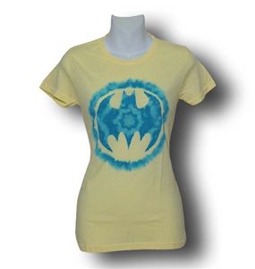 Made from 100% Cotton, this yellow, Junior-sized, woman's T-Shirt features a light blue, Tie Dye Bat Symbol! Groovy, man! This Batgirl tee is perfect for those long, grueling nights of Gotham city stalking, when one feels the need to just sit back and....be, man. Just ....be. I think I saw someone with this same tie dye affected design...although it was a tattoo and not on shirt. She asked me for five dollars. Didn't think it was Batgirl.