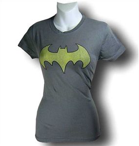 This t-shirt has a distressed Batgirl symbol on a grey junior women's syle shirt. It is absolutely guaranteed to lift and separate the boobies! You'll have to beat guys back with a stick when wearing this shirt, I tell you. All you need is a mask, cape, yellow belt and boots and, "Ka-POW", you're Batgirl.