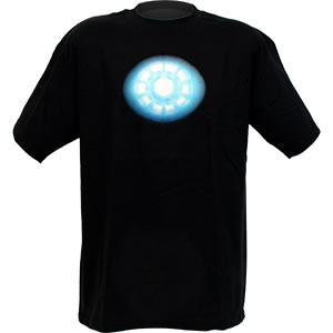 A MarvelShop.com Exclusive! Get ready for Iron Man 2 with this MarvelShop.com EXCLUSIVE "Glowing Repulsor" t-shirt! The front of this 100% cotton black t-shirt features an image of the glowing arc reactor Tony Stark wears in his chest. The image on this t-shirt is embedded with Crystalina Glitter, you can literally see the energy holding back the shrapnel from entering his heart! The back says "Iron Man 2." Available in adult sizes.